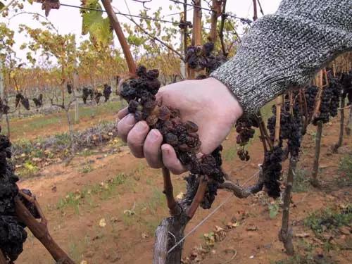 你以為這些真菌會轉(zhuǎn)化成貴腐菌嘛,too young!只有氣候極其合適的時(shí)候這些真菌才會發(fā)展成貴腐菌,大部分時(shí)候它們只配叫灰霉,能做的所有事情就是搞爛你的葡萄。趕上秋雨連綿的時(shí)候,大規(guī)模爆發(fā)的真菌侵染簡直是“車禍現(xiàn)場”。