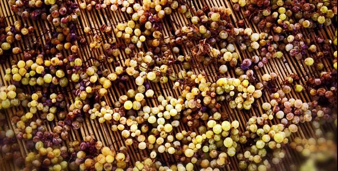 和意大利圣酒在室內(nèi)慢慢脫水?dāng)?shù)月不同,這里的葡萄直接被置于陽光下晾曬12-14天,脫水后進(jìn)行破碎壓榨,糖分、酸度風(fēng)味物質(zhì)都極為濃縮。