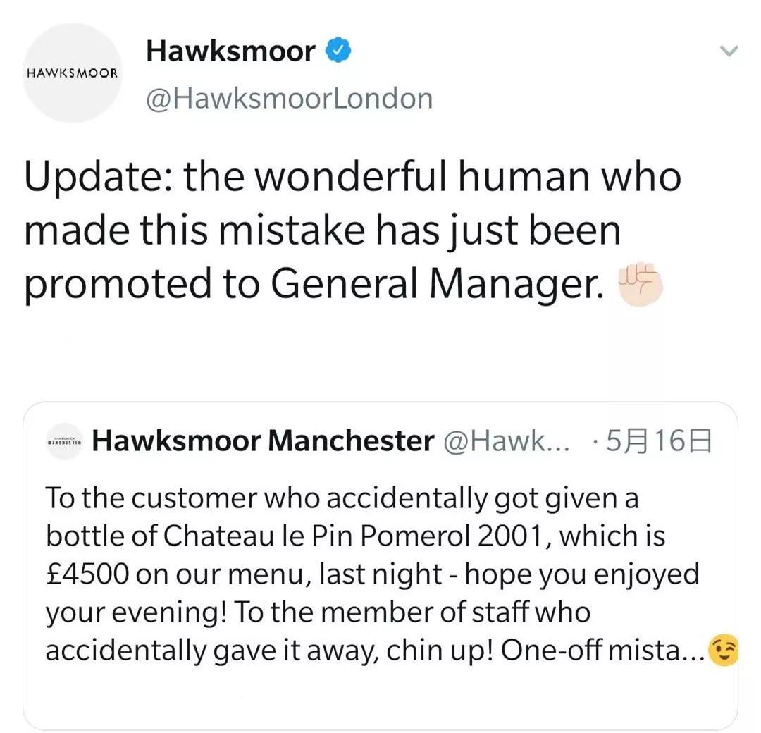 更勁爆的是,時(shí)隔近四個(gè)月,霍克斯莫爾曼徹斯特分店昨天又在推特上公布:“最新爆料:犯下這個(gè)錯(cuò)誤的奇人剛剛被提拔為總經(jīng)理。”
