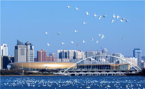 后參觀【天鵝湖國際城市濕地公園】,位于三門峽市東西城區之間的生態區內,現有面積8850畝,其中陸地6150畝,水面、灘涂2700畝,核心景區包括雙龍湖白天鵝觀賞區、陜州古城和沿黃生態林帶三部分,是一處融生態、文化和人文地理于一體的自然山水;