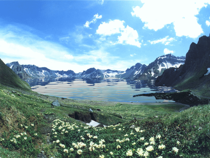 參觀完整的 “一山有四季,十里不同天”的生態系統——長白山四個垂直景觀帶,抵達服務中心,登1422個臺階上峰頂看到【天池】秀麗的風光,是中國最大的活火山口湖,俯看天池水深莫測,到天池頂和北坡可以相互遙望。山頂和朝鮮相連,于【中朝界碑】前合影留念,不用簽證就可以去朝鮮了。