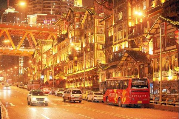 洪崖洞:江景和城市風貌完美融合,以75米高的超常落差,順崖而上,高低錯落、依山而建,成為備受世界矚目的,獨特靚麗的城市名片。坐擁城市旅游景觀、商務休閑景觀和城市??景觀于?體。 以具巴渝傳統建筑特?的"吊腳樓"風貌為主體,依山就勢,沿江而建,魔幻的退臺和高差、流光溢彩的夜景,讓游客嘆為觀止。