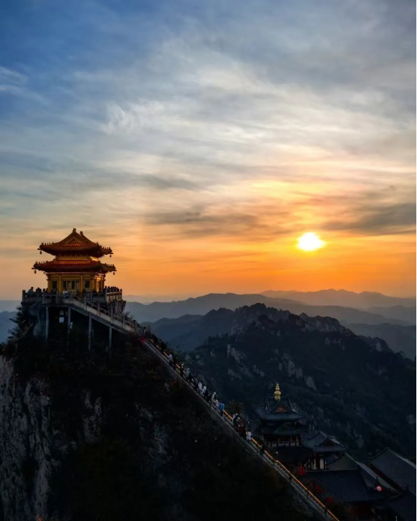 【老君山壯美日落+金頂燈光秀】這里還擁有壯美的日落,當夕陽西下,落日的余暉灑在金殿上,透過霧氣騰騰的云海呈現在世人眼前的是一幅夢幻般的絕美畫卷,似夢中的天上宮闕。當夕陽完全落下,老君山又是另一番夢幻景象。夜色籠罩下的老君山金殿,金光閃閃,猶如披上一層絢麗多彩的面紗,絢麗壯觀,難怪被稱為天下第一仙山。