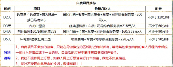 2.自由活動期間的餐食費和交通費、“旅游費用包含”內容以外的所有費用、自費選擇的項目;