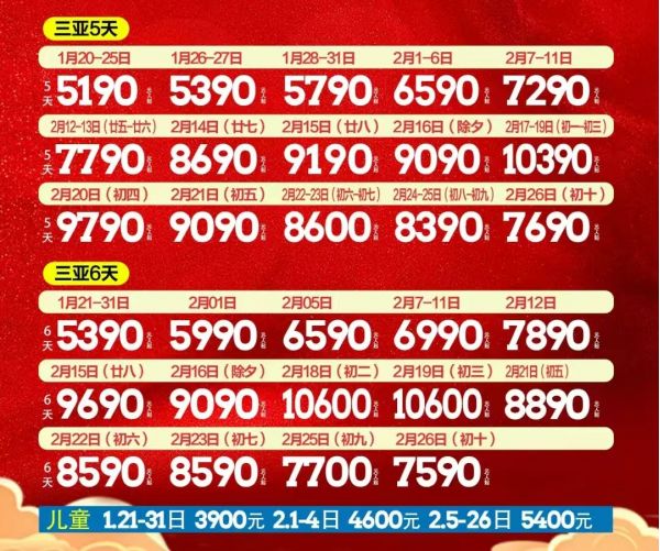 出團日期:五天:1月20-25日1月26-27日1月28-31日2月1-6日2月7-11日?2月12-13日(五-)2月14日(廿七)2月15日(廿八)2月16日(除夕)2月17-19日(初一初三)?2月20日(初四)2月21日(初五)2月22-23日(初六一初七)2月24-25日(初八一初九)2月26日(初十)? 六天:1月21-31日2月01日2月05日2月7-11日2月12日2月15日(廿八)2月16日(除夕)2月18日(初二)2月19日(初三)2月21日(初五)2月22日(初六)2月23日(初七)2月25日(初九)2月26日(初十)