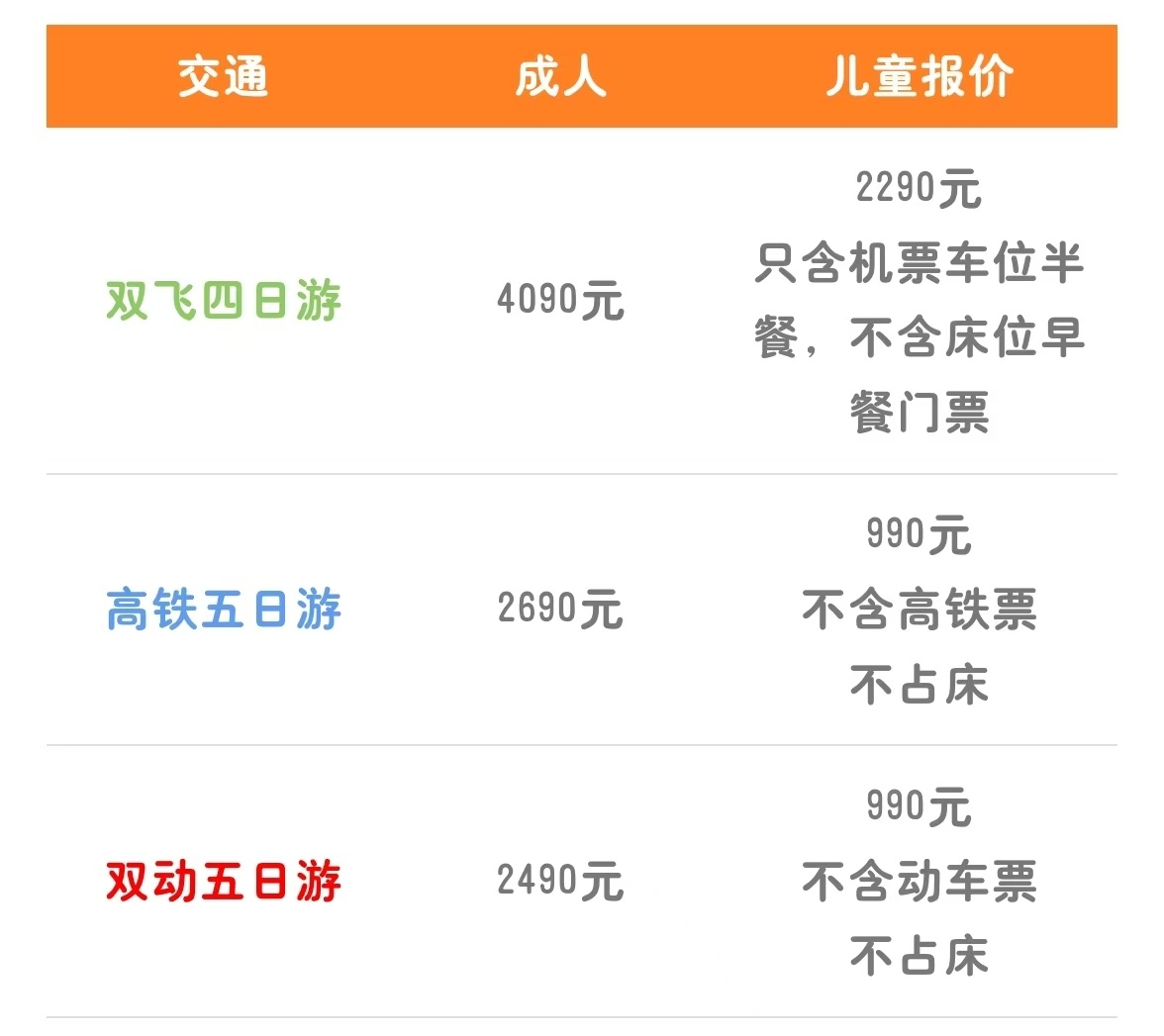 高鐵/動(dòng)車為6歲以下兒童免票(無座)6-14歲半價(jià)(有座位)行程報(bào)價(jià)兒童不含往返車票,報(bào)名時(shí)請確認(rèn)兒童年齡,以實(shí)際出票為準(zhǔn)