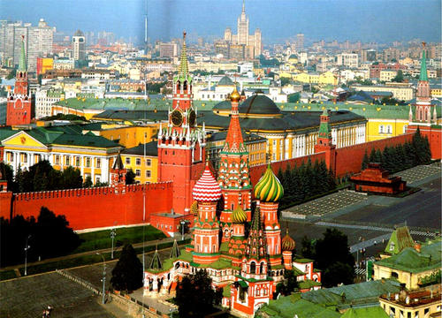【圣瓦西里大教堂】:俄羅斯東正教堂,顯示了16世紀俄羅斯民間建筑藝術風格。整個教堂由九座塔樓巧妙的組合為一體,在高高的底座上聳立著八個色彩艷麗的塔樓,簇擁著中心塔。教堂沒有正面、側面和背面之分,八個塔樓的正門均朝向中心教堂內的回廊,從任何角度看上去都是獨特的風景;