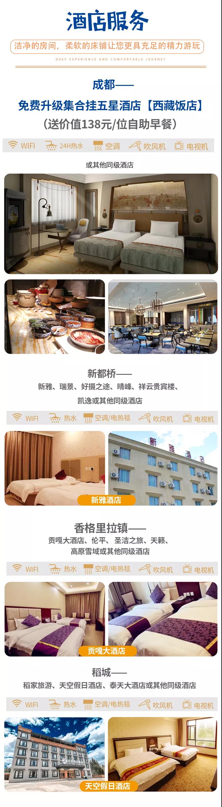 住宿:含全程6天5晚舒適酒店;免費(fèi)升級(jí)出行前成都集合掛五酒店西藏飯店一晚。參考酒店如下(僅供參考,實(shí)際以訂房為準(zhǔn)):