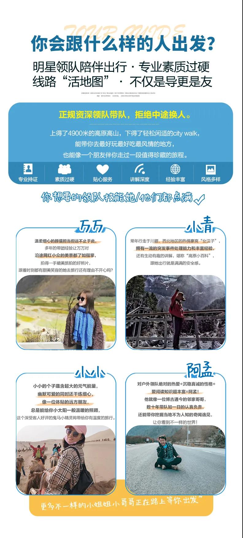 7、導(dǎo)游服務(wù):8人及以上提供正規(guī)持證專業(yè)導(dǎo)游服務(wù);8人以下,由經(jīng)驗(yàn)豐富的司機(jī)提供向?qū)Х?wù)。