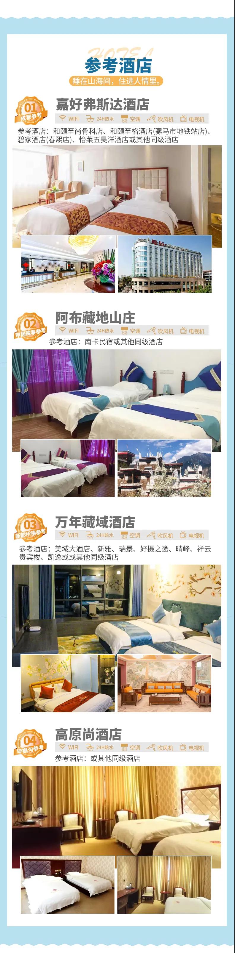 4、住宿:含全程5天4晚舒適酒店,確保酒店干凈衛(wèi)生,溫馨舒適。因沿途高原藏區(qū)條件有限,如果酒店設(shè)施沒有達(dá)到您的期望,敬請諒解。參考酒店如下(僅供參考,實(shí)際以訂房為準(zhǔn)):