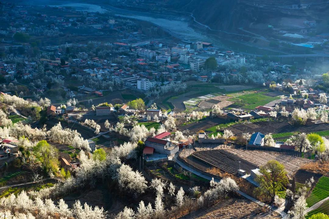 我們的團(tuán)期是金川最好的時(shí)節(jié),萬物復(fù)蘇的初春三月,正值金川成千上萬棵梨樹花期,雪白色的梨花競相開放,一片片、一層層的鋪散開來,漫山遍野的白色花海中夾雜零星新綠,空氣中氤氳著梨花清香,眼是天堂,身亦是天堂。