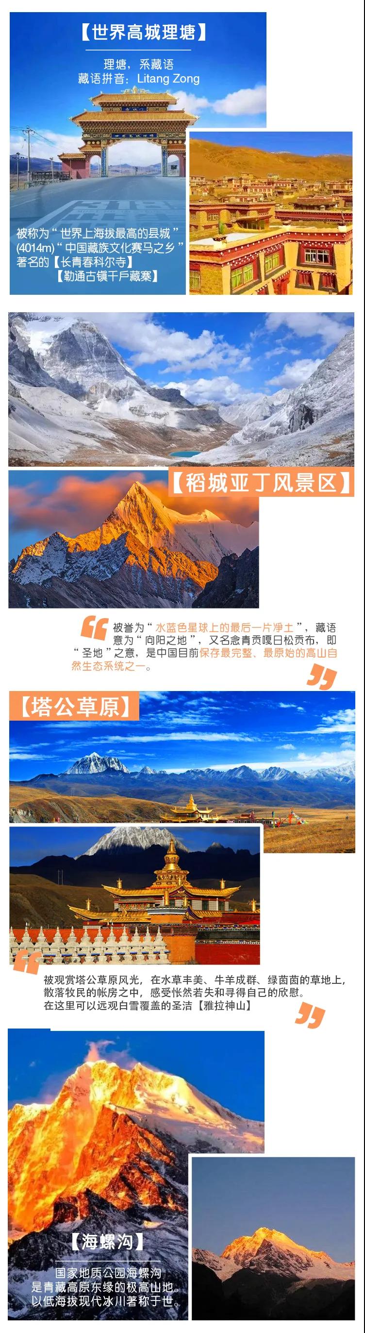 香格里拉鎮—稻城—世界高城理塘(長青春科爾寺、勒通古鎮千戶藏寨)—新都橋鎮