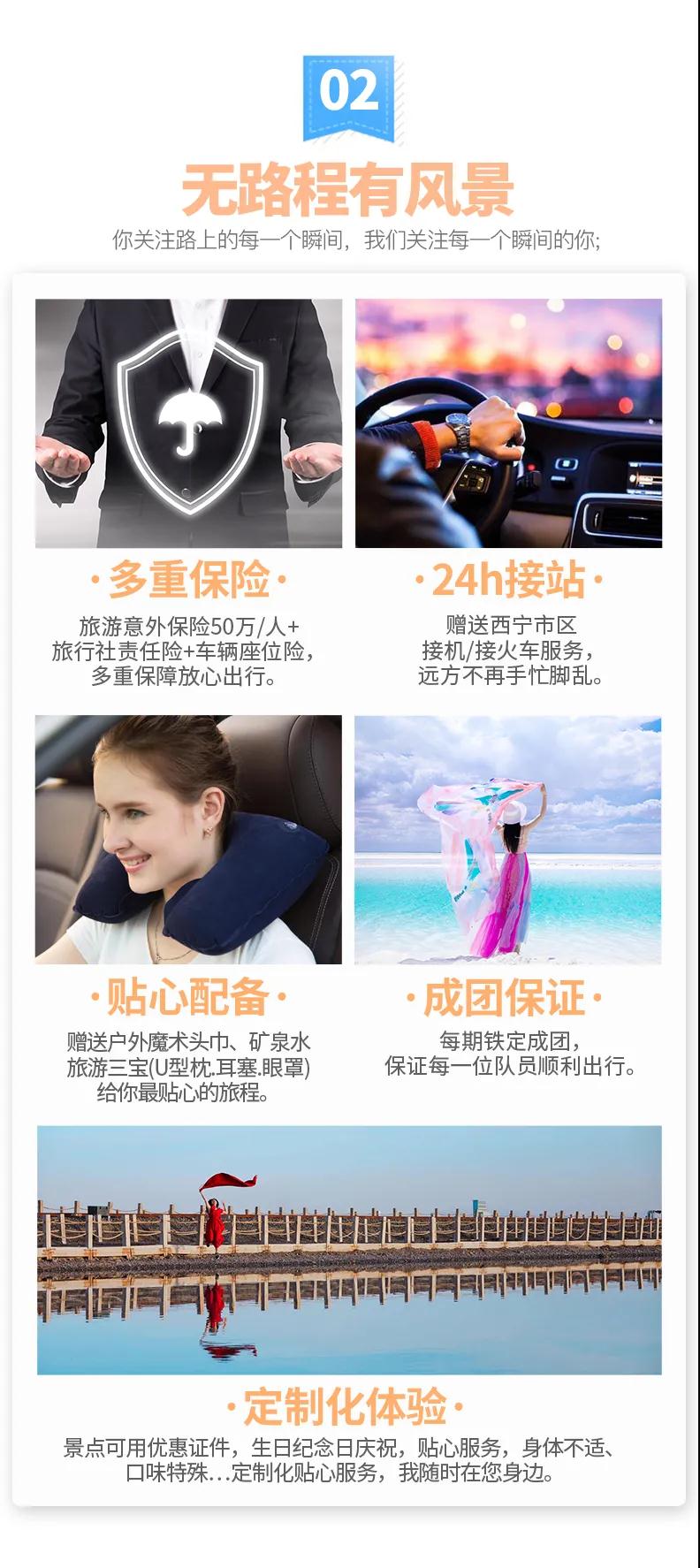 5、贈送:贈送西寧市區24小時接機/接火車服務;贈送戶外魔術頭巾、旅游三寶(頸枕耳塞眼罩)、礦泉水。(贈送項目不用費用不退)