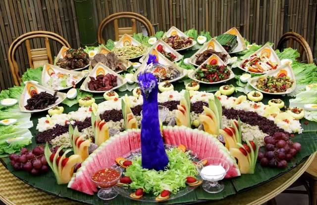 午餐享用較有特色的云南十大主題名宴之一西雙版納【孔雀宴】從原料選擇、烹飪制作,到造型擺盤、餐具搭配,每個細節都精巧細致,別出心裁。例如活靈活現的孔雀頭,形神兼具的孔雀尾,還有利用干冰營造出的仙云輕霧,讓本就美麗的孔雀更添仙氣兒,吃貨朋友們稱之為“瑤臺孔雀宴”。