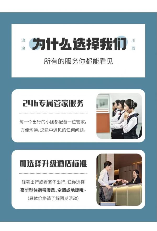 私人訂制:我們業務范圍囊括了全國各大城市,川西、西北、新疆、西藏,在路上永遠有我們的身影。我們將為每一個有定制需求的你策劃出獨屬于自己的完美旅行。
