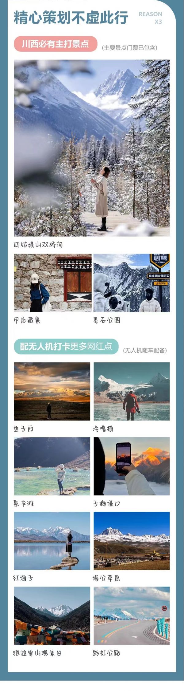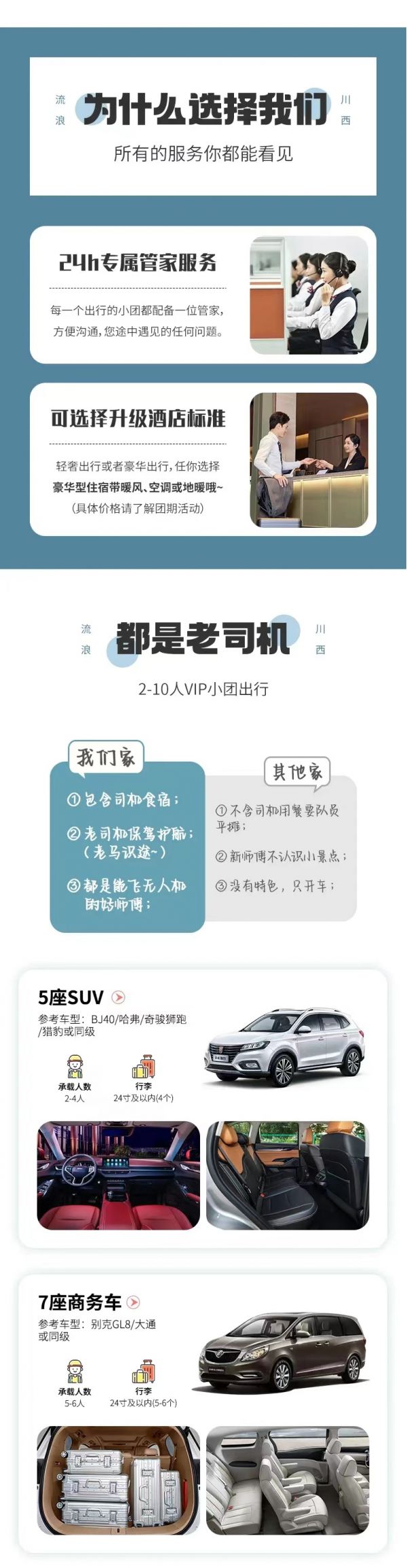私人訂制:我們業務范圍囊括了全國各大城市,川西、西北、新疆、西藏,在路上永遠有我們的身影。我們將為每一個有定制需求的你策劃出獨屬于自己的完美旅行。