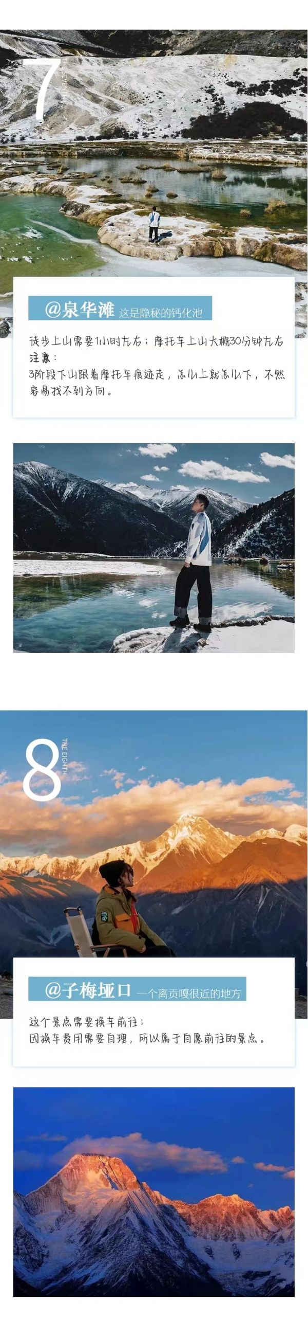 早餐后出發,前往冷嘎措, 徒步時間步 2-3 小時(可選擇騎馬單面 200,或者摩托車往返200,費用自理),到達冷嘎措自由拍攝大片( 海拔4500 左右,切記帶上厚外套, 以及帽子圍巾墨鏡,冷噶措風大溫度低,以防感冒高反), 觀貢嘎雪山、藍冰(藍冰根據溫度決定)然后下撤返回(冬季若遇大雪下撤時間根據實際情況安排),返回途中可以繼續前往泉華灘進行游玩。晚上入住上木居。