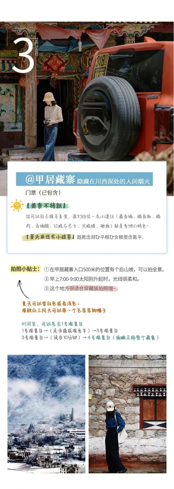 早餐后酒店集合出發,沿岷江而上,沿途經都江堰、紫坪埔水利工程,沿都汶高速抵映秀,沿途感受2008年汶川大地震“地動山搖、山崩地裂、滄海桑田”后的景象,感悟大自然的力量;觀看震后統一重建的具有民族特色的民居,感受人定勝天的威力。而后從映秀出抵耿達鄉沿臥龍峽谷,欣賞峽谷小橋、流水、枯藤、老樹的美麗風光,而后經巴郎山可觀映山紅、紅白杜鵑花、松蘿、高山草甸等;觀看植物從常綠闊葉林到高山荒漠的垂直變化,感受“一山觀四季、十里不同天”的氣象變遷。中午抵達四姑娘山。午餐后游玩雙橋溝,景區開闊平坦、景點集中,全程通車。雖已開發,但環境維護的出于意料的好,景區內各種服務包括指示也十分清晰明了,游客們可以更加舒適、方便的游覽整個景區。由于整條溝海拔落差達到一千多米,所以地貌比較豐富,風景也完全值得期待。給人遠離塵世的感悟。游玩盡興后出溝前往甲居藏寨入住民宿。甲居藏寨是藏在川西里的世外桃源,被譽為《中國最美鄉村古鎮》的甲居藏寨,是川西環線上的必經路~
