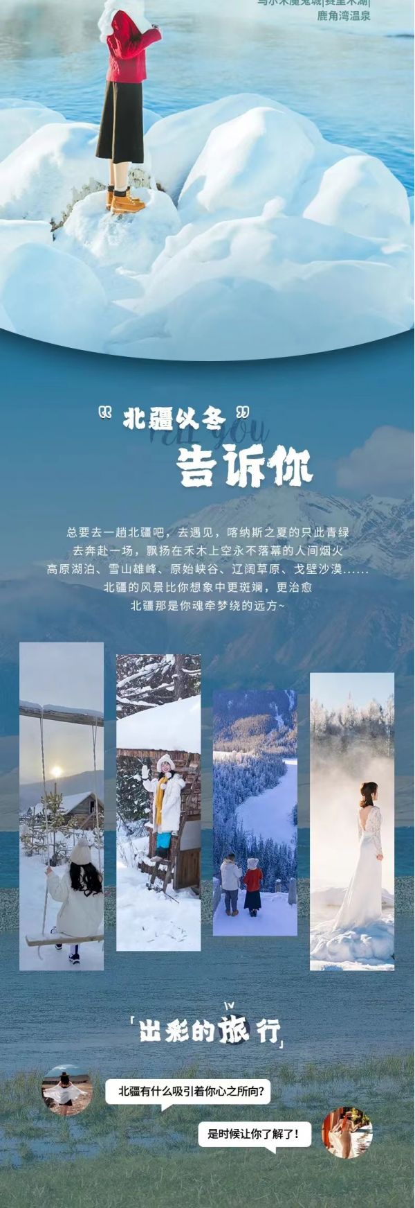 早起趁著天色未亮,裹件皮大衣登上哈根平臺,搓著手,跺著腳等待禾木冬季的日出,當火紅的圓形緩緩出現在地平線的時候,腳下是炊煙裊裊正慢慢蘇醒的村落,被慢慢照亮,如果沒有太陽的色彩,眼前就像一幅靜止的水墨畫,只是人在畫中。在零下三十攝氏度的戶外,看當地人叼羊,車拉犁,滑野雪,撒水成冰,圍觀古老的毛皮滑雪比賽,住進外古內新的木頭房,看馬拉爬犁在圖瓦人的木屋間穿梭,聽歡歌笑語在親朋好友間傳送,感受圖瓦人有趣歡樂的氛圍。然后前往【世界魔鬼城】在這里可以欣賞到千奇百怪的雅丹地貌,遠眺風城,宛若中世紀的一座古城堡,但見堡群林立,大小相間,高矮參差,錯落重迭,給人以凄森蒼涼恐怖之感。