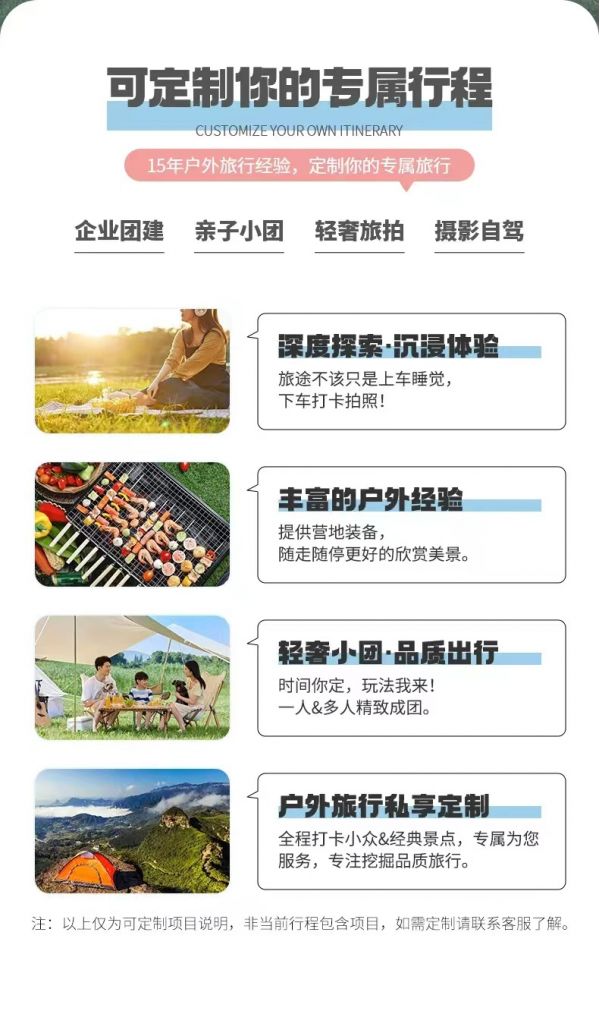 私人訂制:我們業務范圍囊括了全國各大城市,川西、西北、新疆、西藏,在路上永遠有我們的身影。我們將為每一個有定制需求的你策劃出獨屬于自己的完美旅行。