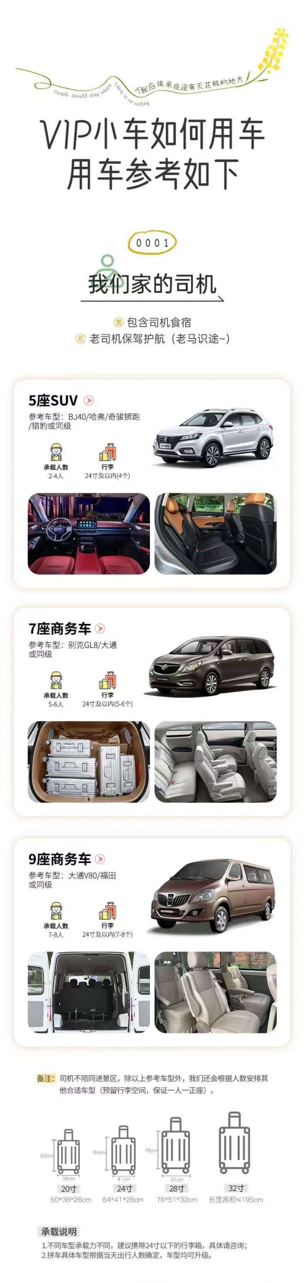 為保證成團及質量,根據人數派不同座位數用車,保證每人一正座;