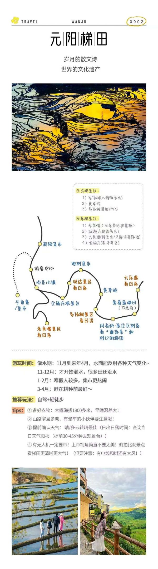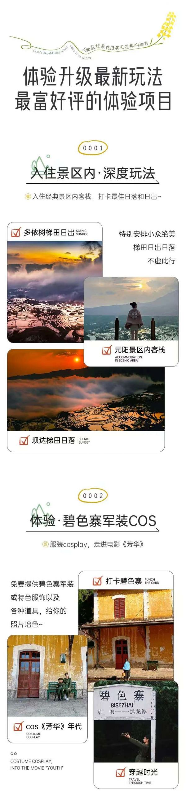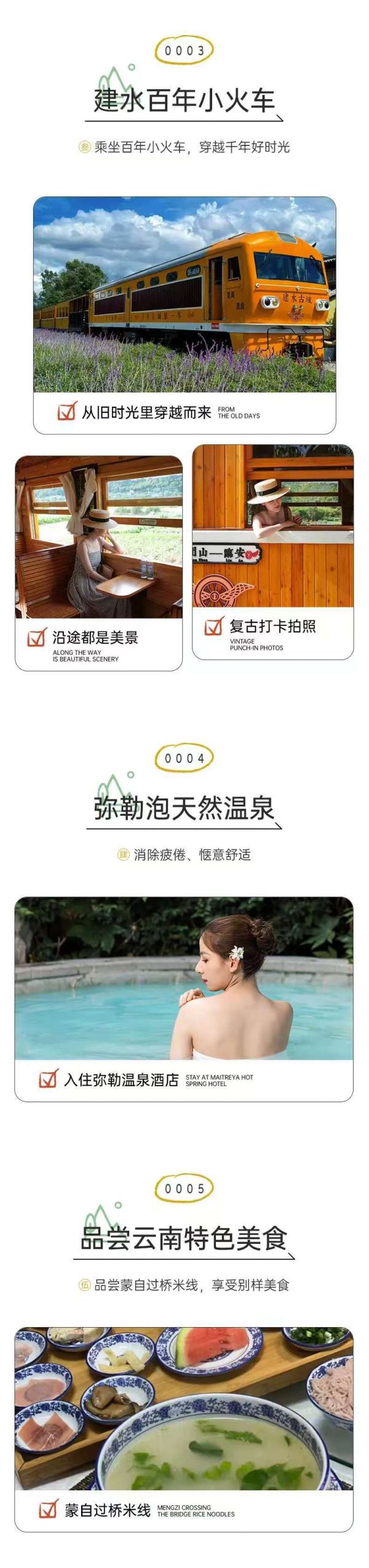 包含元陽景區門票(元陽現實行單點單獨檢票制,我們購買為單次門票,不能重復進入景區,如果希望多次進入需另自費購門票)、 九龍瀑布景區門票、金雞嶺門票、蒙自電瓶車費、東風韻門票+景交、滇越小火車單程門票。