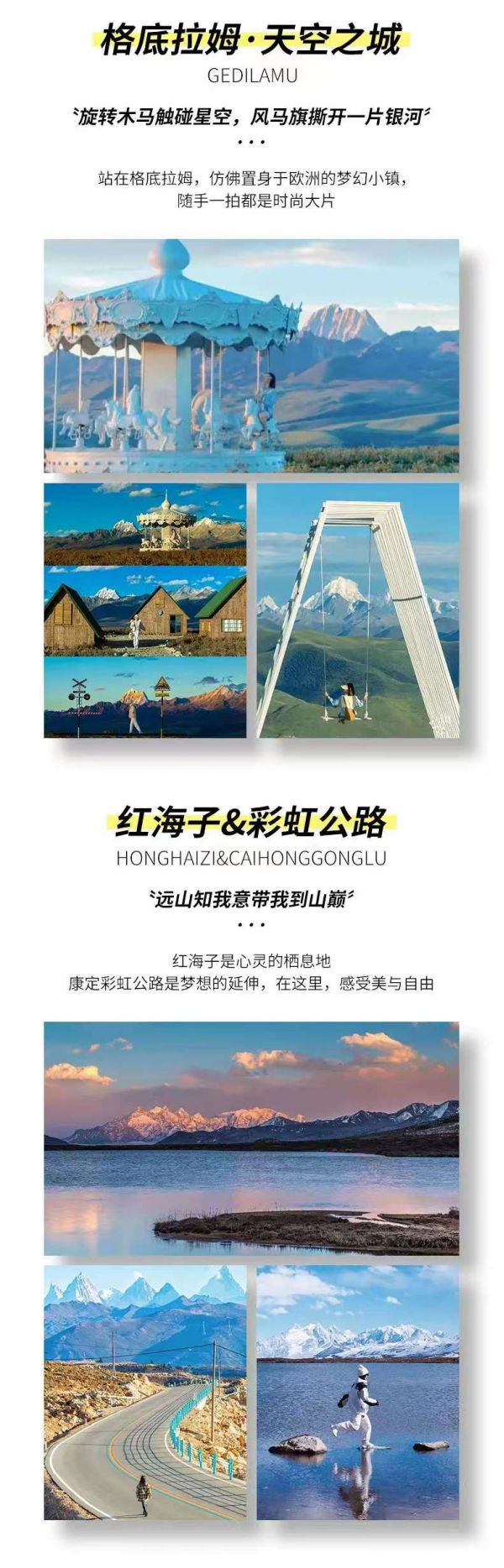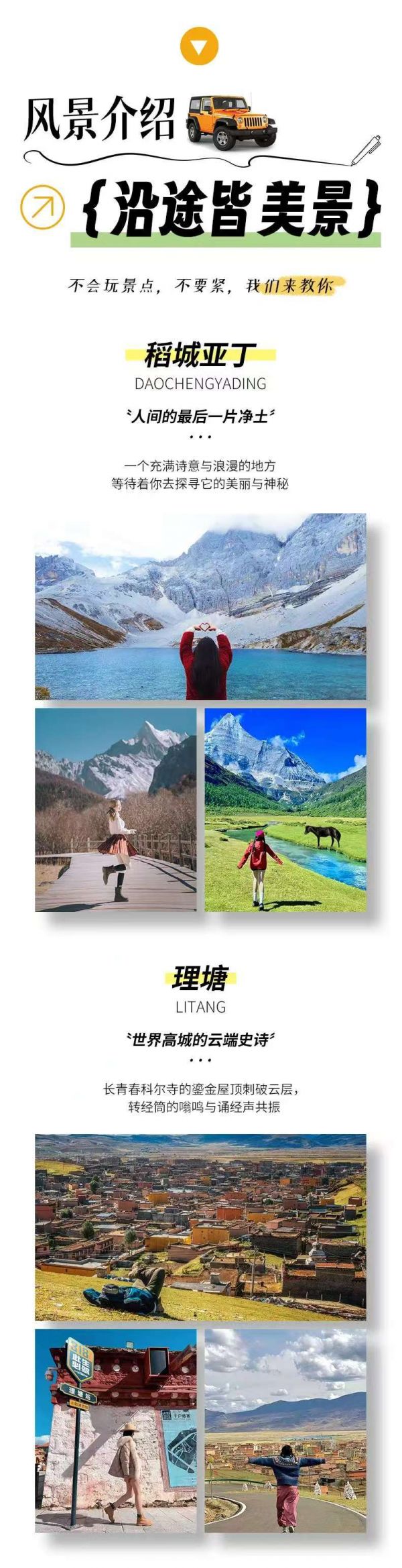 但領隊進景區拍攝需要同車一起AA領隊門票費用,門票預估:紅海子清潔費15-30元/人;魚子西/格底拉姆/八郎生都清潔費30元/人;稻城亞丁(旺季價格)門票+觀光車266元/人、(淡季價格)門票+觀光車240元/人、沖古寺服務區至洛絨牛場電瓶車往返80元/人,單程50元/人(可選擇)、洛絨牛場往返騎馬費用300元/人,價格隨季節浮動(可選擇,不建議乘坐);理塘:套票100元/人;木雅大寺15元/人;四姑娘山雙橋溝:門票80/人+觀光車70/人。