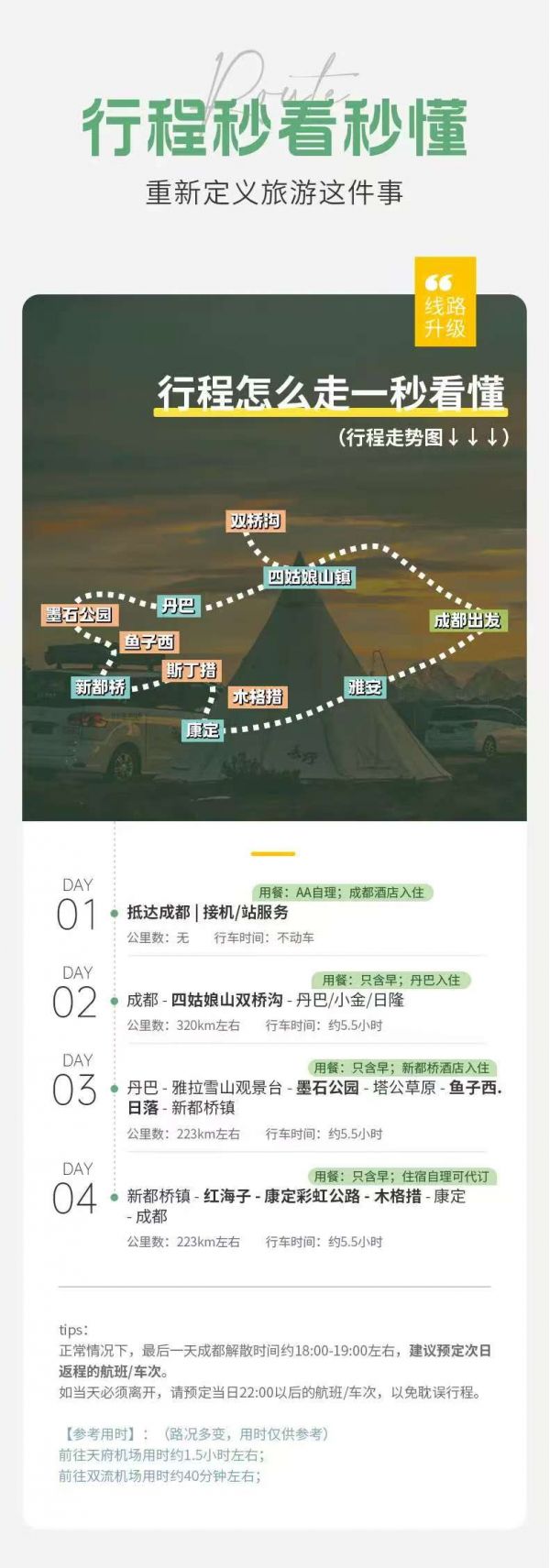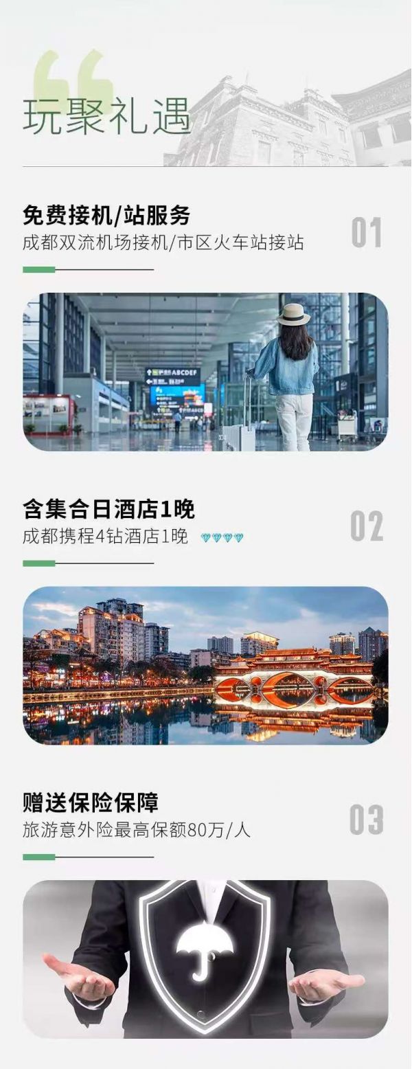 (1)此日不含住宿,如需代定,請(qǐng)?zhí)崆白稍兛头聠危?br /> (2)如果需要當(dāng)天離開成都,建議訂晚上22:00以后的航班。由于返回路程較長,可能會(huì)因?yàn)樾蘼贰⒔煌ü苤疲萝嚨⒄`時(shí)間,實(shí)際到達(dá)時(shí)間可能更晚,最好是預(yù)訂次日返程大交通。
