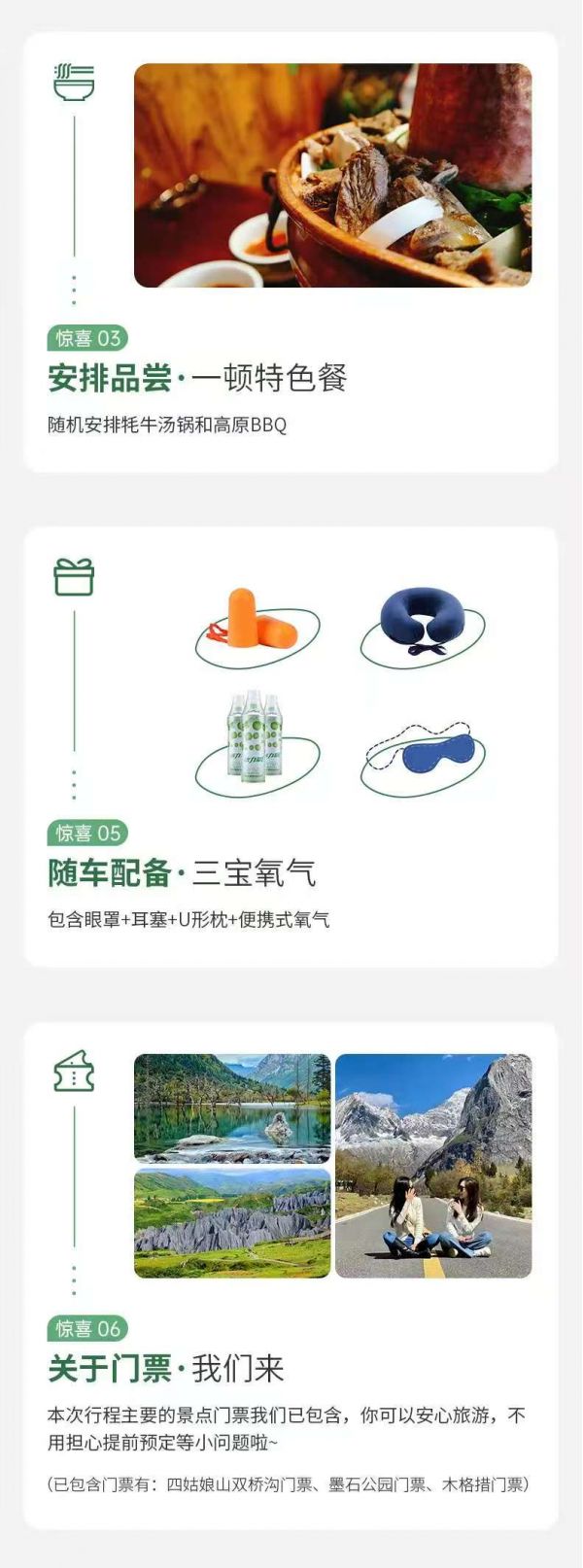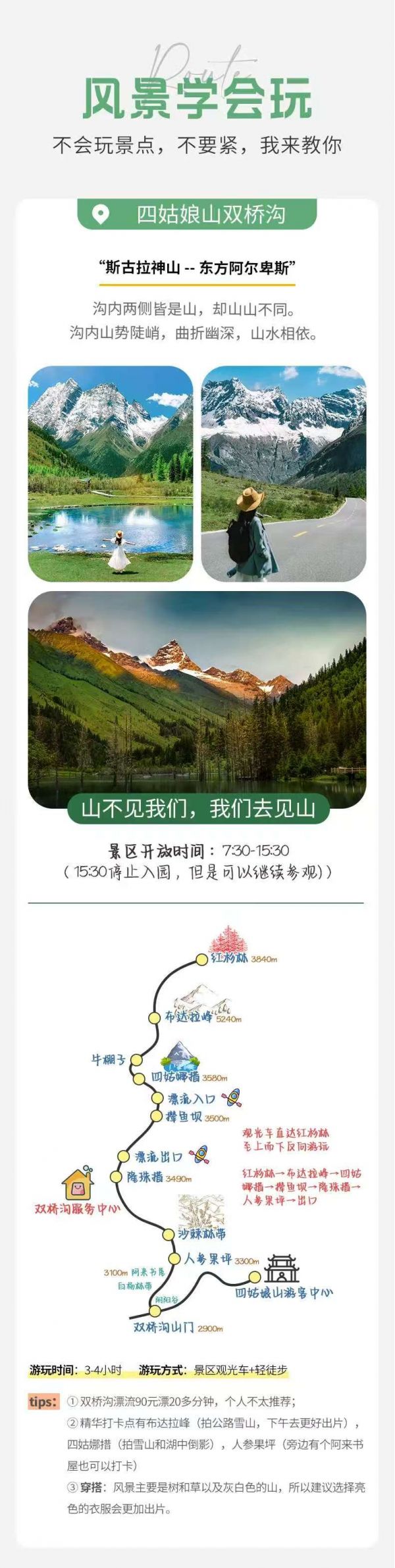 初到高原,建議緩步行走,適應(yīng)高原氣候,尊重少數(shù)民族風(fēng)俗習(xí)慣。因雙橋溝有限流要求,如遇票滿,我們將更換安排海子溝和長坪溝的門票,以上兩個(gè)景點(diǎn)也同屬四姑娘山。