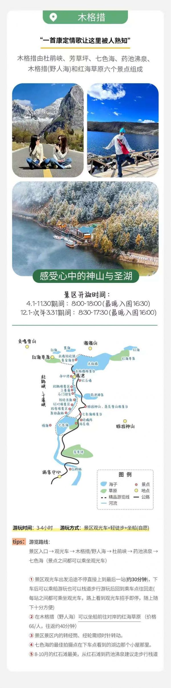 前往木格措景區(qū),大概游玩3-4小時(shí)左右,景區(qū)內(nèi)除可觀賞”臥虎觀月”、“石佛鎮(zhèn)海”等山景外,在各個(gè)季節(jié)的不同時(shí)辰還可觀賞到“雙霧墜海”、“木格夕照”、“木格晨曦”、“木格潮汐”和迭瀑飛泉等云、霞、霧、水奇景,海濱珍珠沙灘可享沙浴、日光浴之樂。