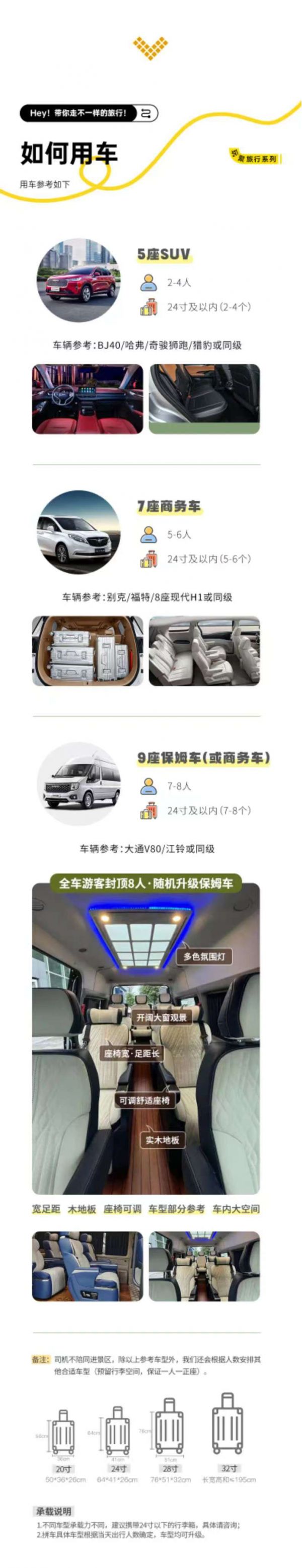 為保證成團及質(zhì)量,根據(jù)人數(shù)派不同座位數(shù)用車,保證每人一正座;