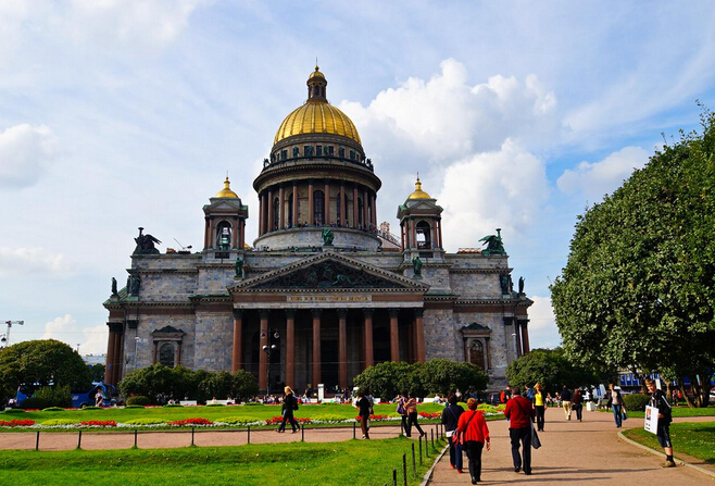 今天部分拍攝點包括夏宮花園,瓦西里島以及十二月黨人廣場。【圣伊撒基耶夫大教堂】(外觀約10分鐘)也叫圣伊薩基輔大教堂,始建于1707年,已有300年歷史。廳和殿皆以大理石裝飾,且有以貴重的藍、綠孔雀石材質(zhì)建成的立柱,美不勝收。被認為是僅次于羅馬梵蒂岡圣彼得大教堂、德國科隆大教堂的世界第三大教堂。伊薩基耶夫教堂,是圣彼得堡的象征。晚餐后入住酒店休息。交通:巴士