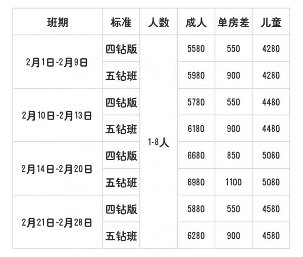 成人 ¥6980 /人, 兒童 ¥5080 /人