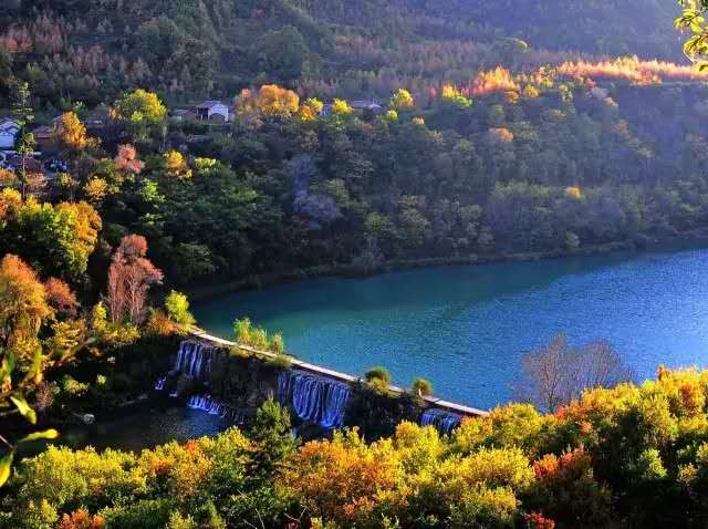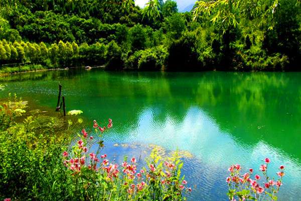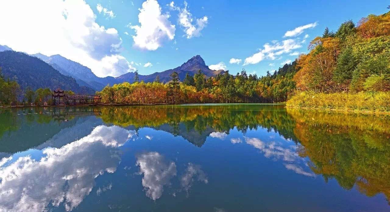 官鵝溝水美。13個(gè)大小不等、形態(tài)各異的湖泊,尤如一串綠色的珍珠鑲嵌在溝內(nèi),湖水清澈透底,隨湖底地貌高低呈不同顏色,那些倒映在湖中的古樹象一條條巨龍臥在湖底。藍(lán)天白云和青山古樹,映入湖中,使天地渾然一體,沒有界限。