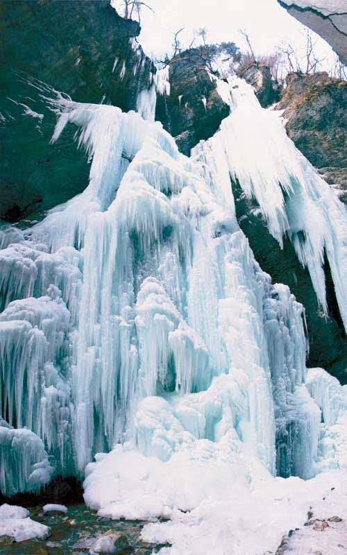 尊敬的游客朋友,剛才我們欣賞了蔚然壯觀的石壁天河,馬上就要看到風(fēng)韻萬千的白石山了。峰回路轉(zhuǎn),一道瀑流忽然從天而降,猶如一條銀龍從空中飛下,悠悠忽忽,晃晃蕩蕩,神態(tài)瀟灑自如。細(xì)看這條瀑布,它是從幾十丈高的山崖頂上落下的,自古只有水往低處流,而這里的山崖兩側(cè)溝內(nèi)無水,崖頂卻有瀑布,真是“水往高處流”。隨河風(fēng)輕拂,它飄飄灑灑,飄逸而矯健,給人以無限聯(lián)想,“飛流直下三千尺,凝似銀河落九天”正是它的傳神寫照。潔白的瀑流擊在棱角突兀的巖石上,濺起串串晶瑩的珍珠,向四面八方飛散而去。道道涓涓細(xì)流,化成條條白龍,從巖石的四周蜿蜒游去。在官鵝溝眾多的瀑布中,九天飛瀑以它的凌空飛瀉,瀟灑自如而獨(dú)樹一幟。