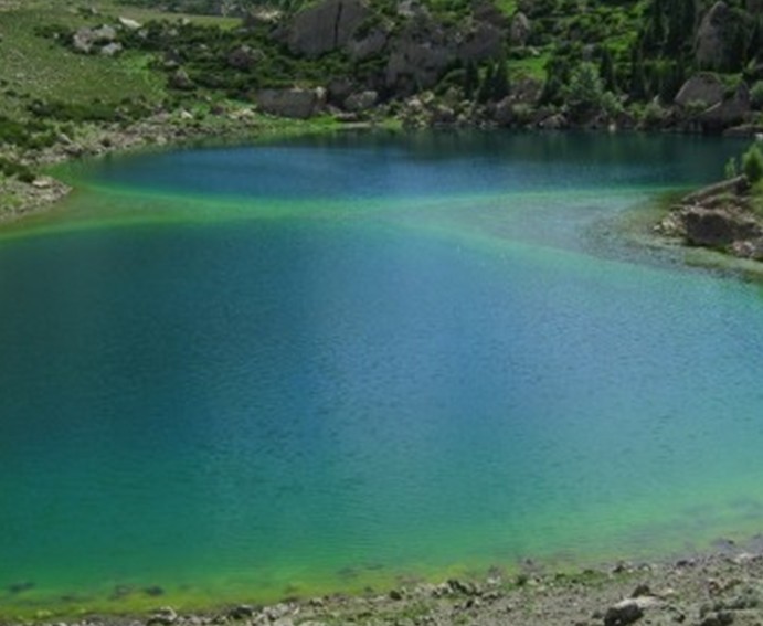 從庫車出發大約120公里的天山深處,有兩個高山湖泊。他們被稱作大龍池、小龍池,景色十分秀麗迷人。海拔2390米,緊鄰217國道。大龍池水面積約2平方公里,海拔3700米,四周環山,由天山雪水融匯而成,水域寬闊,清澈見底,終年白雪皚皚,雪線以上生長著名貴中藥材--雪蓮。山下云杉翠柏,綠草如茵,牛羊成群,牧民的氈房點綴其間,偶爾還可見雪雞、黃羊和雪豹。