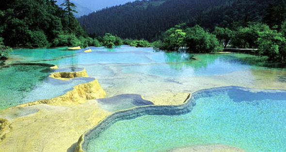 進入黃龍景區,首先看到的是一組精巧別致、水質明麗的池群--迎賓池。池子大小不一,形狀奇特,色彩艷麗,錯落有致,四周山岳環峙,林木蔥蘢,山間野花競放,彩蝶飛舞。山間石徑曲折盤旋,點綴著觀景亭閣,倍添情趣。