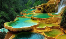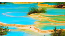 這一片景觀,還有緊傍森林的明鏡倒影池、掩映于杜鵑花叢間的婆蘿彩池和擁有彩池500多個,鈣化景觀中色彩最為豐富的爭艷池。