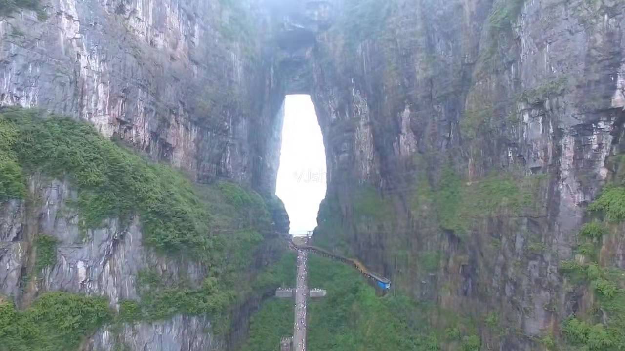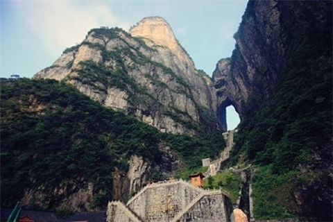 天門山古稱嵩梁山,三國吳永安六年(公元263年) ,山體忽然峭壁洞開,玄朗如門,形成迄今罕見的世界奇觀——天門洞。吳帝孫休認為這是吉祥的征兆,于是易嵩梁山為天門山。天門洞是天門山最具有代表意義的景點,它位于天門山山體的中上部,海拔1300米,門高131.5米,寬57米,深60米,是世界上最高海拔的天然穿山溶洞。