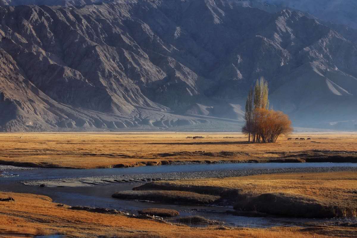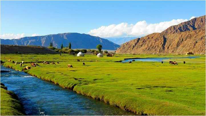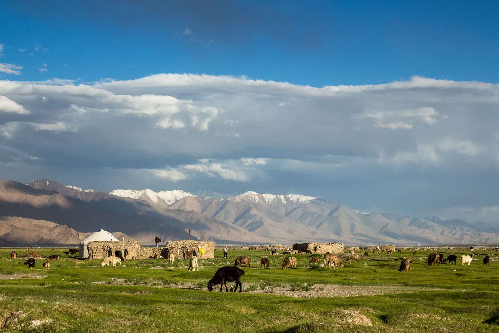 阿拉爾金草灘就在塔什庫爾干縣城邊上,在石頭城下,因那里有一個叫阿拉爾的鄉(xiāng)村,故得名阿拉爾金草灘,因有塔什庫爾干河流經(jīng)此處,這里水草豐美,牛羊遍地,和遠處的雪山白云藍天交融在一起十分漂亮。我們去的時候夕陽夕照,碧綠的草灘一片金色,遠處牧人白色的氈房,羊群都沐浴在夕陽下,阿拉爾金草灘由此得名。