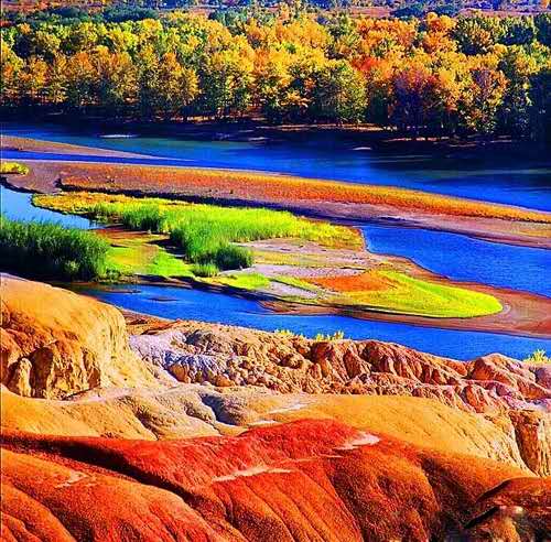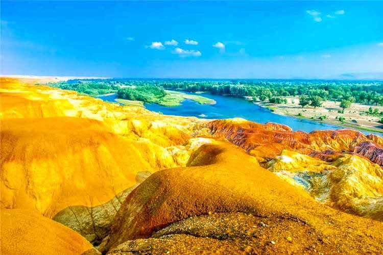 5—10米,土梁高一般為5—15米,最大高度約25米,高低錯落,分布面積3平方公里左右。這里地處干旱多風地帶,由于河岸巖層間抗風化能力的強弱程度不一,形成參差不齊的輪廓,巖層以紅色、土紅色、淺黃和淺綠色砂巖、泥巖及砂礫巖組成,巖石色澤各異,版權所有山東聊城聊之旅國際旅行社有限公司,轉載必究!五彩繽紛,狀如彩色古堡、怪獸、峰叢等奇特造型的地貌,是典型的彩色丘陵。大風起時,會發出怪異的聲音,更增添了神秘的色彩。它的開發建設無疑對喀納斯景區是景上添花,客流量及經濟效益可觀。五彩河岸將以其典型和獨特的地貌形態,吸引著國內外游客來此旅游觀光。