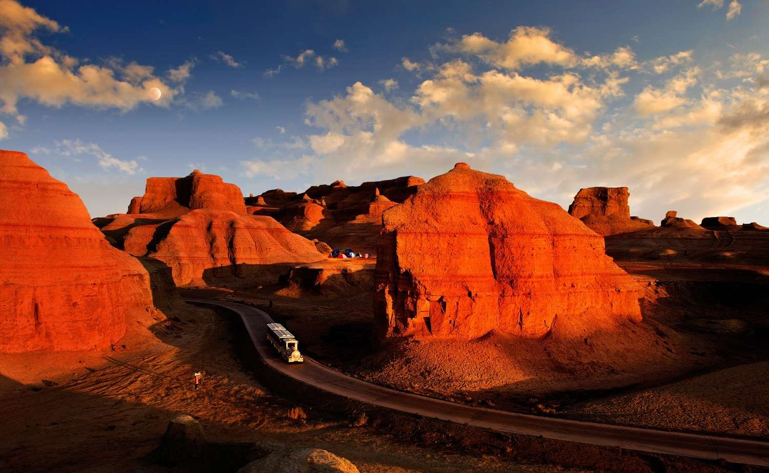 魔鬼城位于哈密市五堡鄉以南,距五堡鄉20Km,距哈密市約100Km,由于它神秘莫測,不熟悉地形的人若遇風暴,有迷失方向的危險,哈密雅丹地貌東起煙墩外的駱駝峰,經雅滿蘇鐵礦,大南湖煤礦,到五堡沙爾湖十三間房等長約400公里,寬約5-10公里,在哈密屬于特殊的地理環境,它是經過漫長的風蝕自然而形成的。 在魔鬼城可以看到那些酷似城堡、殿堂、佛塔、碑、人物、禽獸形態各異的景觀、令人眼花繚亂的陡壁懸崖、以及混跡巖礫中五光十色的瑪瑙、隨處可見的硅化木、枝葉清新的植物化石,偶爾可獲得象恐龍蛋化石的小圓石頭,海生的魚類化石、鳥類化石,當夜幕降臨時有時會聽到鬼哭狼嚎令人發指的嘶叫,因此才被人們稱之為“魔鬼城”。版權所有山東聊城聊之旅國際旅行社有限公司,轉載必究!其實這里還真正存在著古城堡建筑、古民房遺址―艾斯克霞爾古城堡:離地面約六米的風蝕臺上的長方形的土夯建筑有高約五米,前面有門有窗的居住地,這就是人類活動之地、是古絲路的驛站或是哈密王朝的西南前哨,據當地人推測,此地西面的沙爾湖(由流沙通向羅布泊)干涸之前,這里也有村莊人家,當水源游移(地殼變化)沙爾湖消失后,林木飛鳥在風沙中,部分變為化石,而此地居住的人只得背井離鄉,連先祖的遺骨也移走了、至今僅有遺址。哈密魔鬼城已是國家AAAA級景區。