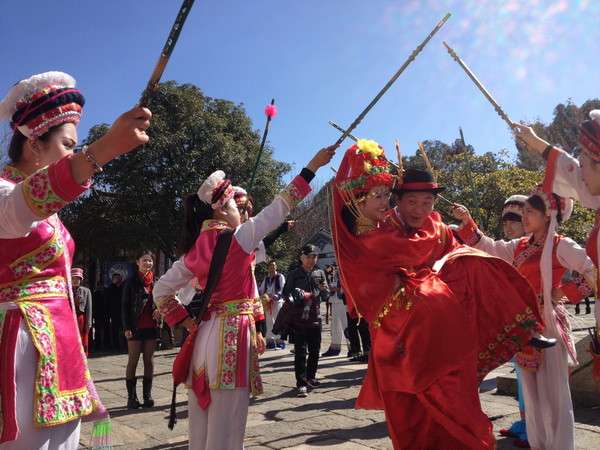 在周城至今仍能看到白族婚禮中古老而典雅的新娘裝束。新娘頭