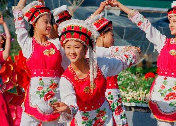 女子腰身苗條、婀娜,衣著色彩鮮艷、明快又大方。尤其是她們的繡花包頭,體現(xiàn)了大理的“風(fēng)花雪月” 四景。看,彎彎的包頭像洱海里的新月;艷麗的朵朵繡花代表了上關(guān)花;頂端潔白的纓須像蒼山頂?shù)陌籽欢H垂下的纓穗隨風(fēng)飄灑,顯示了下關(guān)的風(fēng)。