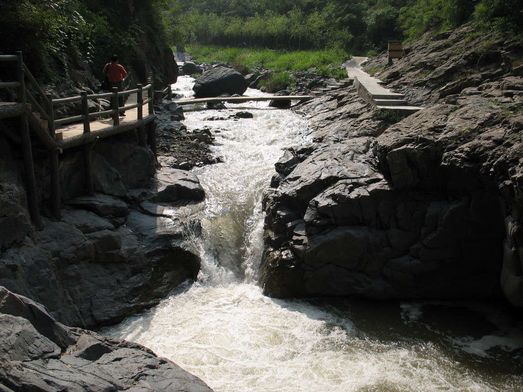 沸水潭:又叫鍋滾潭,此處水流湍急,潭深數米,西漢末年王莽追趕劉秀,劉秀逃到此地,人困馬乏,將土們饑渴難耐,劉秀見這劉秀個峽谷山勢險峻,便吩咐士兵拾柴,生火,做飯。一大鍋水剛燒至沸,忽聞哨兵來報,追兵將至,將士們慌成一團,人亂馬嘶,將一大鍋開水踢翻,此后形成一潭,水浪猶如沸水一般,瀑下潭內有一深坳,如燒火灶。因而當地百姓稱之為鍋滾潭。