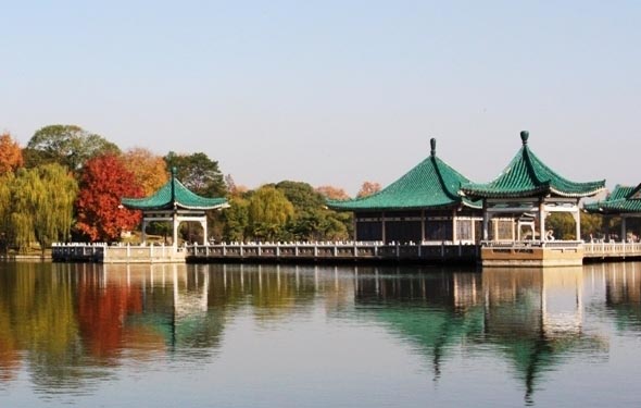 與瀕湖畫廊相鄰,是一組以自然湖地貫以曲橋亭廊的園林建筑。這里飼養金魚80多個品種,游人步廊觀魚。四周碧水漣漪,滿目荷葉,照臉成碧。