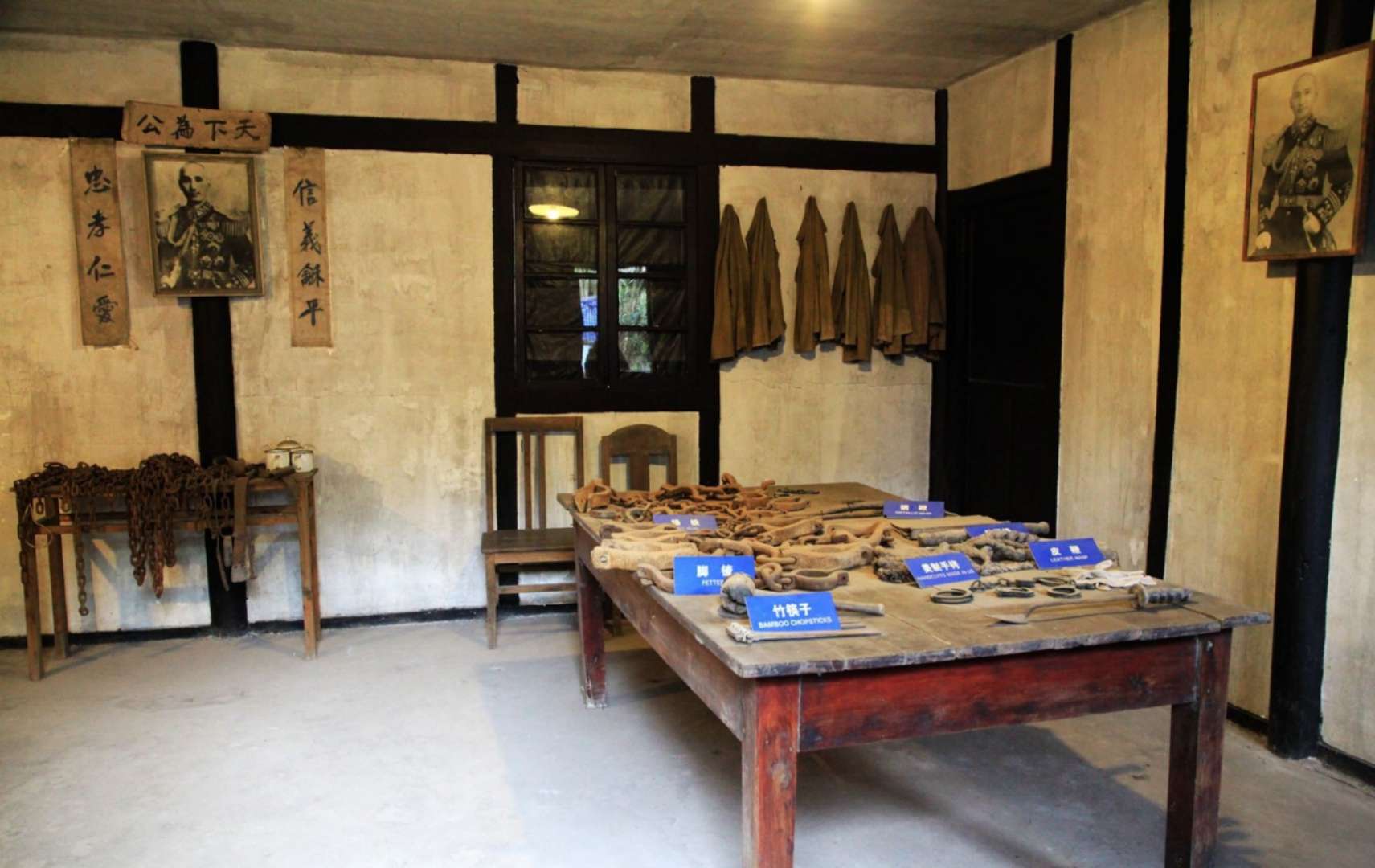 外院是辦公室、刑訊室。外院墻上寫有“長官看不到、想不到、聽不到、做不到的,我們要替長官看到、想到、聽到、做到”等標語。渣滓洞有牢房、審訊室、看守所長室,還有審訊臺、鐵鎖鏈、竹簽、辣椒水、老虎凳等酷刑,“老虎凳”是一個長凳子,再把手腳都捆到凳子上,給腳腕下落磚頭,落到第三層的時候腿就斷了。在白公館和渣滓洞里,有近三百英烈在這里被殺害。