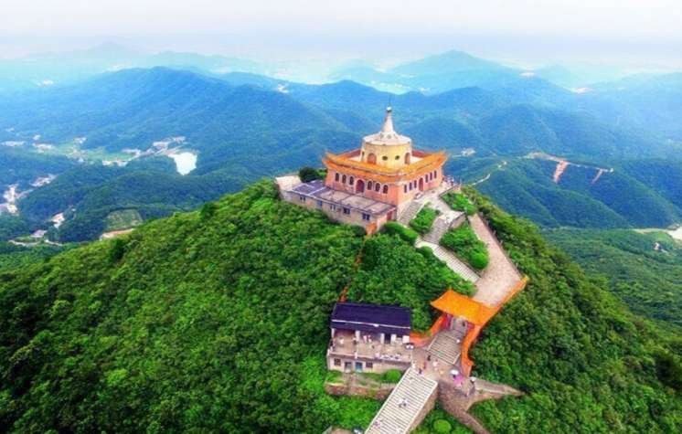 韶峰頂上唐時有韶峰庵,后來有仙頂靈廟,俱毀。1993 年在峰頂修復了古寺廟,由中國佛教協會會長、著名書法家趙樸初題詞:韶峰古寺。寺殿門聯為:“舜帝南巡奏揚韶樂傳天下;紅日東出播種福田在人間。寺分上下兩層,下層為一大廳,廳正中南向塑有舜帝金身,北向則為娥皇、女英。舜帝顯得雍容慈祥,二妃眼含凄切。舜帝左右靠墻處,有彩塑四大金剛,三面墻頂塑有二十四位諸天、十八位羅漢,神態、裝束各異,栩栩如生。上層又作觀日臺。韶峰寺——觀日臺(觀日閣)采用仿金字塔造型,底邊四角均為75°。這種結構穩定、堅固、抗震、防強風,又能收到金字塔效應:人處塔中,身心格外舒暢,并產生一種奮發向上的力量。同時,韶峰寺——觀日閣又融入了中國傳統文化中“天圓地方”的意蘊:其下部為正方形,上部為圓錐形,寺體由方而圓,愈上愈尖,至頂部綴有一顆錚亮的銀色金屬球,球上,一柄鋼針直插藍天。