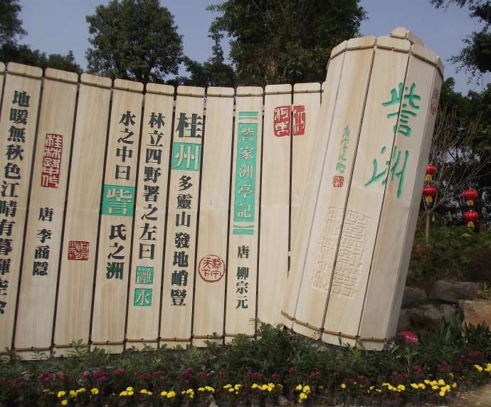 右是毛澤東手書的柳宗元散文《別舍弟宗一》一文的節選:零落殘魂倍黯然,雙垂別淚越江邊。一身去國六千里,萬死投荒十二年。桂嶺瘴來云似墨,洞庭春盡水如天。版權所有山東聊城聊之旅國際旅行社有限公司,轉載必究!欲知此后相思夢,長在荊門郢樹煙。左邊則是柳宗元的《江雪》:千山鳥飛絕,萬徑人蹤滅。孤舟蓑笠翁,獨釣寒江雪。石塑右上角雕刻著“柳河東”紅色印章。柳宗元祖籍河東,就是今天山西永濟的位置,后來遷到長安(今陜西西安),所以世人就把他稱為柳河東。又因為他官終廣西的柳州刺史,所以又稱他為柳柳州。石碑上雕刻的人物就是唐代著名思想家、文學家柳宗元,他應裴行立邀請,來到桂林訾洲島寫下的《訾家洲亭記》,詳細描繪了訾洲的秀麗景色。