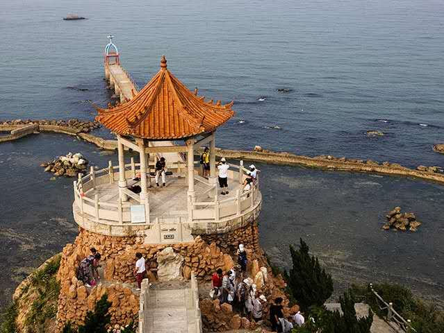渤海雄渾之日落,南瞻“八仙相聚”的蓬萊閣,北眺遼東半島的老鐵山。仙境源東部開口處臨海而立,頓感開闊,該村人在此建一亭閣,高大約16米,順懸崖勢造陡峭臺階,左拐延伸出了一架棧橋,棧橋周圍劃出幾處釣魚臺與海上游樂場;右拐直達至海灘,四周懸崖峭壁圍成一處半圓灣,實屬一靜謐之所,灘上卵石約 3 米厚,光潔與柔潤。身臨仙境源、心情舒暢、飄然欲仙!